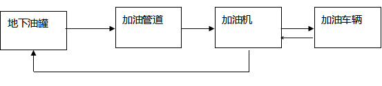 加油工藝:加油作業(yè)時(shí),采用潛油泵提供的動(dòng)力,油品通過加油管道至加油機(jī),進(jìn)入受油容器。同時(shí),加汽油作業(yè)時(shí),有油氣回收回收系統(tǒng),汽油蒸汽通過油氣回收管道回至汽油罐。具體流程見下圖: